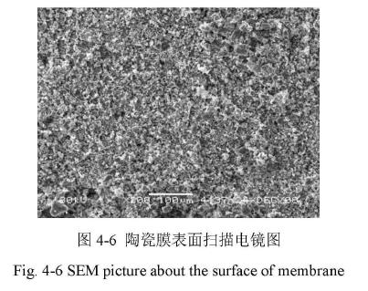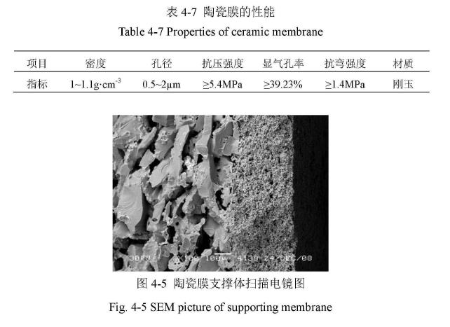 陶瓷膜的主要性能見表,陶瓷膜的支撐體和表面的微觀結(jié)構(gòu)見圖和圖。由掃描電鏡可以看出,該膜有良好的結(jié)構(gòu)層次,支撐體與陶瓷膜表面結(jié)合緊密,膜表面孔徑大小也比較均勻。