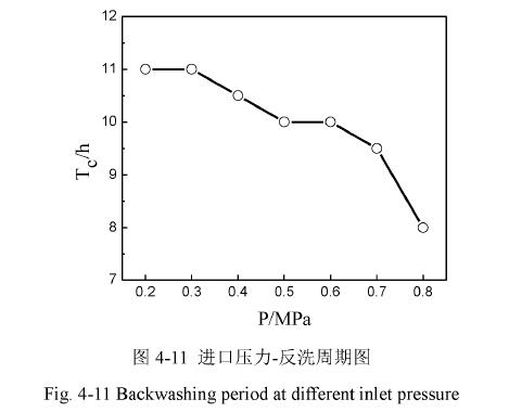 從圖來看,反洗的周期在進(jìn)口壓力超過以后迅速下降。經(jīng)過分析,可能是因?yàn)閴毫^大以后,在陶瓷膜的內(nèi)外壁的壓差也隨之,容易在膜的表面形成較致密的污染層;另一方面,過大的壓力導(dǎo)致沉淀區(qū)出現(xiàn)過多的擾動(dòng),使本已沉淀下來的磷酸銨鎂浮動(dòng)起來,惡化了膜表面的堵塞情況。