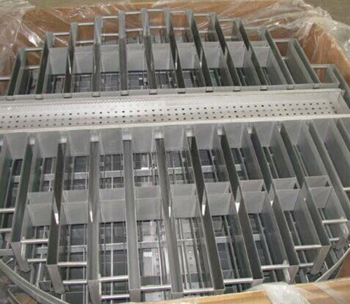 實現(xiàn)傾斜板對全截面的覆蓋,能夠對液體收集時提升收集效率,這是柵板式支承-收集-再分布器的最Z大優(yōu)點,但是對于上升氣流的干擾以及高度的增加,會導致其性能受到一定程度的影響。因此,應該采用合理的方式對柵板式支承-收集-再分布器進行改進。柵板支承絲網填料的過程中,液體受到上升氣流的影響,會通過塔壁四周流下。這是由于在網片中存在一定程度的毛細作用,加上上升氣流的上舉力作用,導致液體下落有在困難。為了有效對液體進行收集,需要采取合理的導流措施。為了便于液體分散落入分布槽中,可以將柵板下緣設計為鋸齒狀。液體沿內壁流下后通過集液環(huán)由環(huán)形槽收集。多孔型和溢流型柵板式支承-收集-再分布器的設計,能夠分別在小流量和大流量操作中提升工作效率。